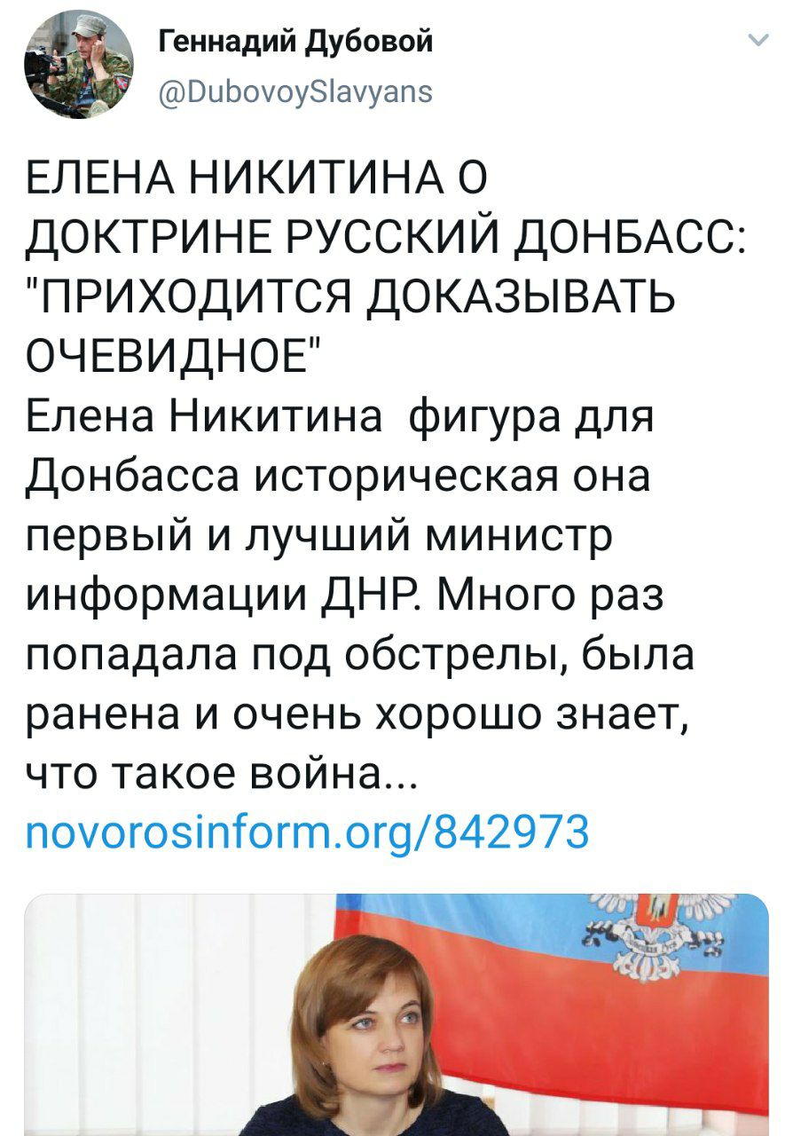 1. До Никитиной министром информации ДНР был Александр Хряков. Поэтому она не первая, а ты не в теме вообще.