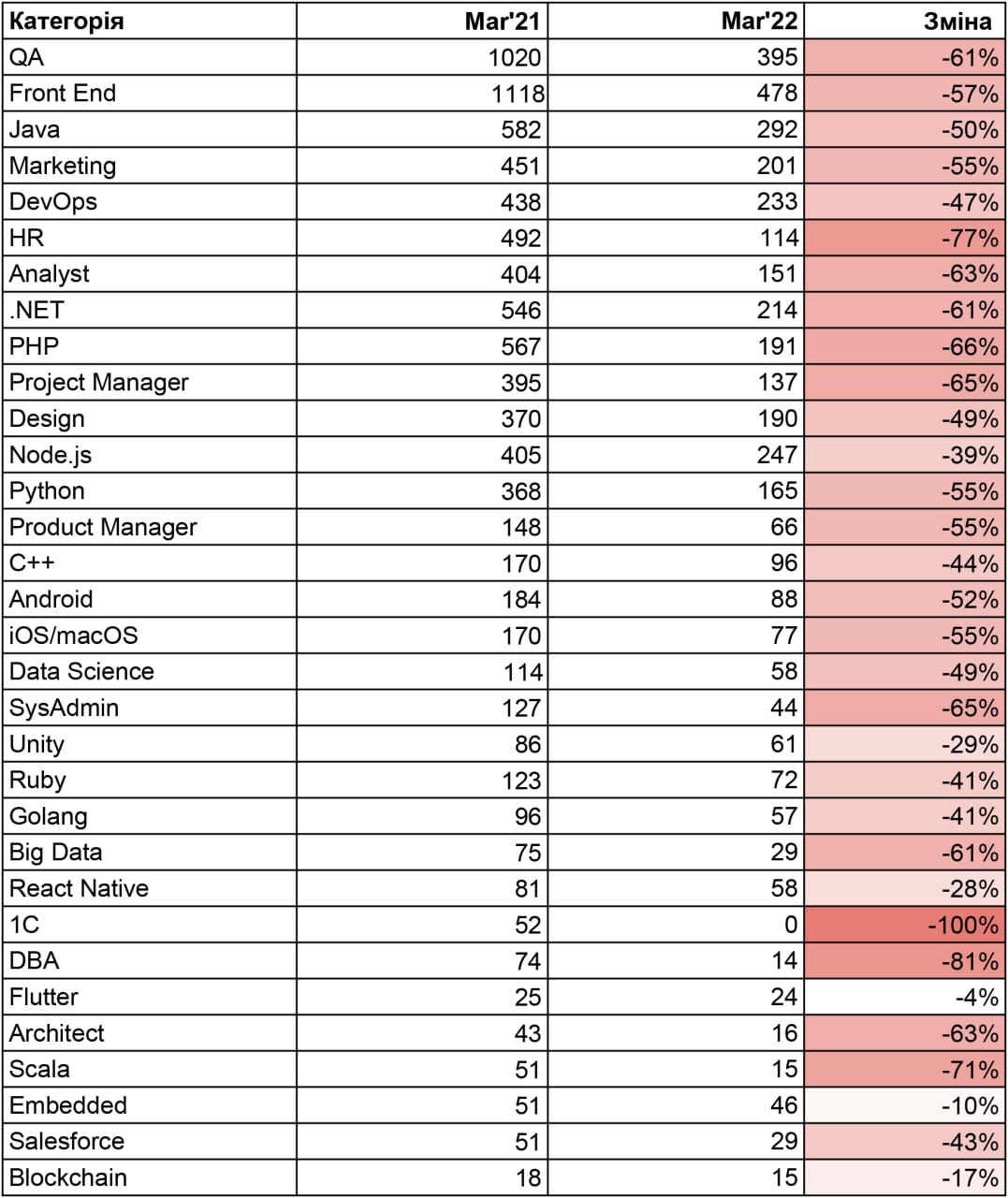 🔻 Найбільш негативна динаміка — у 1C (що очевидно), DBA, HR, Scala, PHP, SysAdmin, Project Manager.