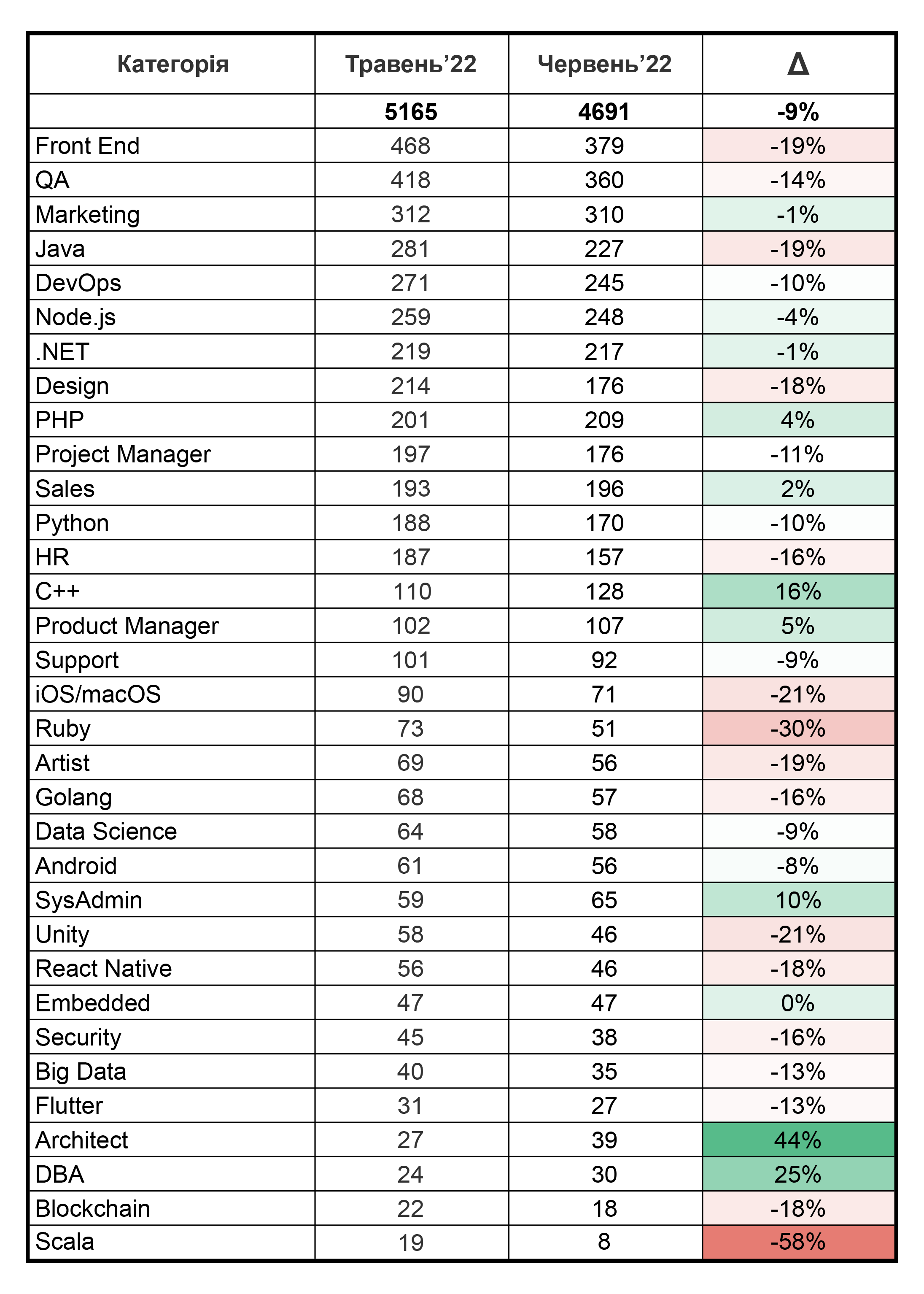 Також значно зменшились вакансії для Front-end, iOS/macOS, Blockchain, Unity, React Native та Java.
