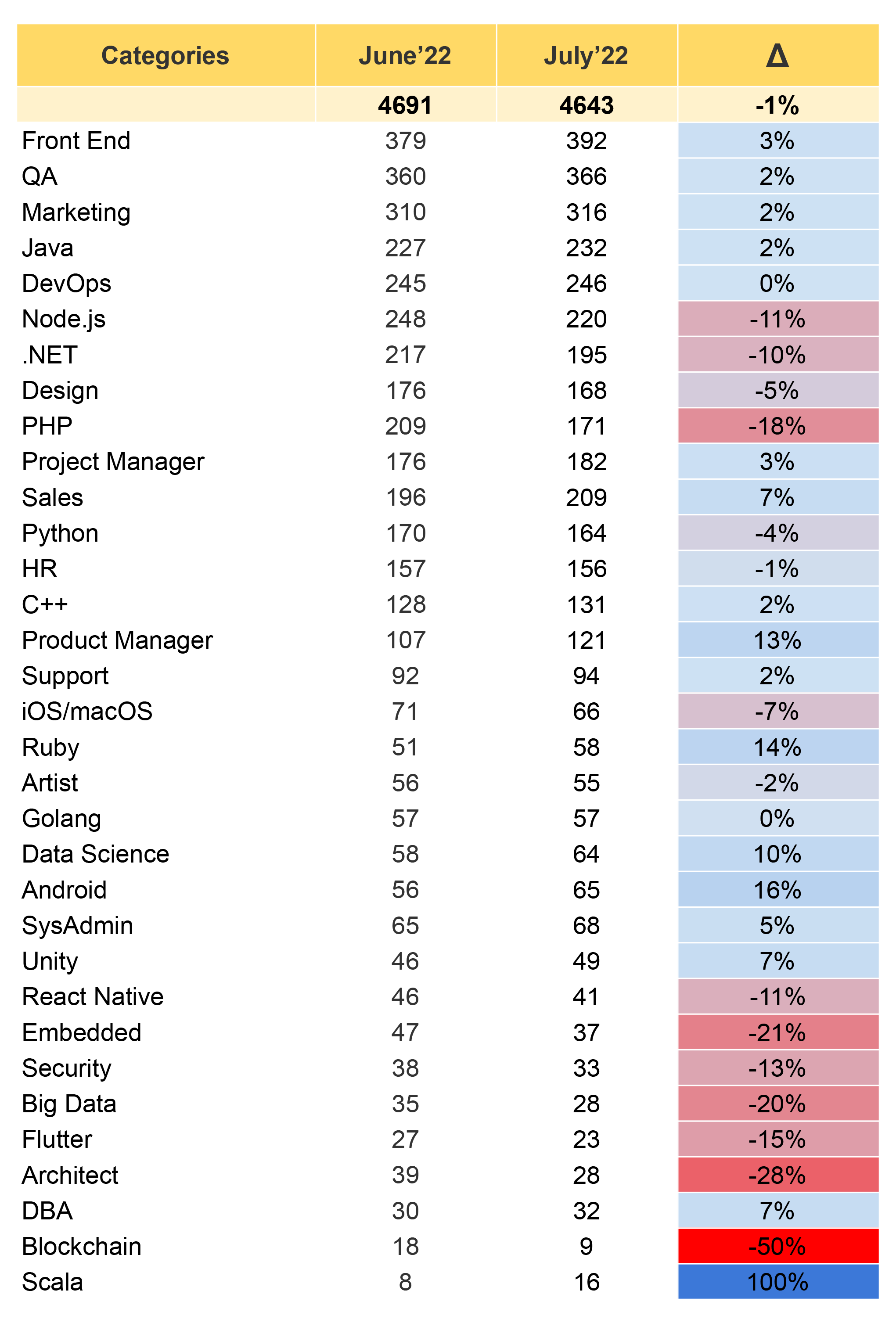 Загалом на DOU було опубліковано 4643 вакансії, тобто їхня кількість зменшилась на 1%, якщо порівнювати з червнем.