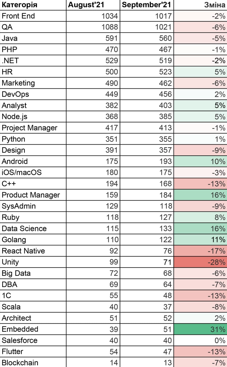🟩 Найпозитивніша динаміка — у Embedded, Product Manager, Data Science, Golang, Android та Ruby