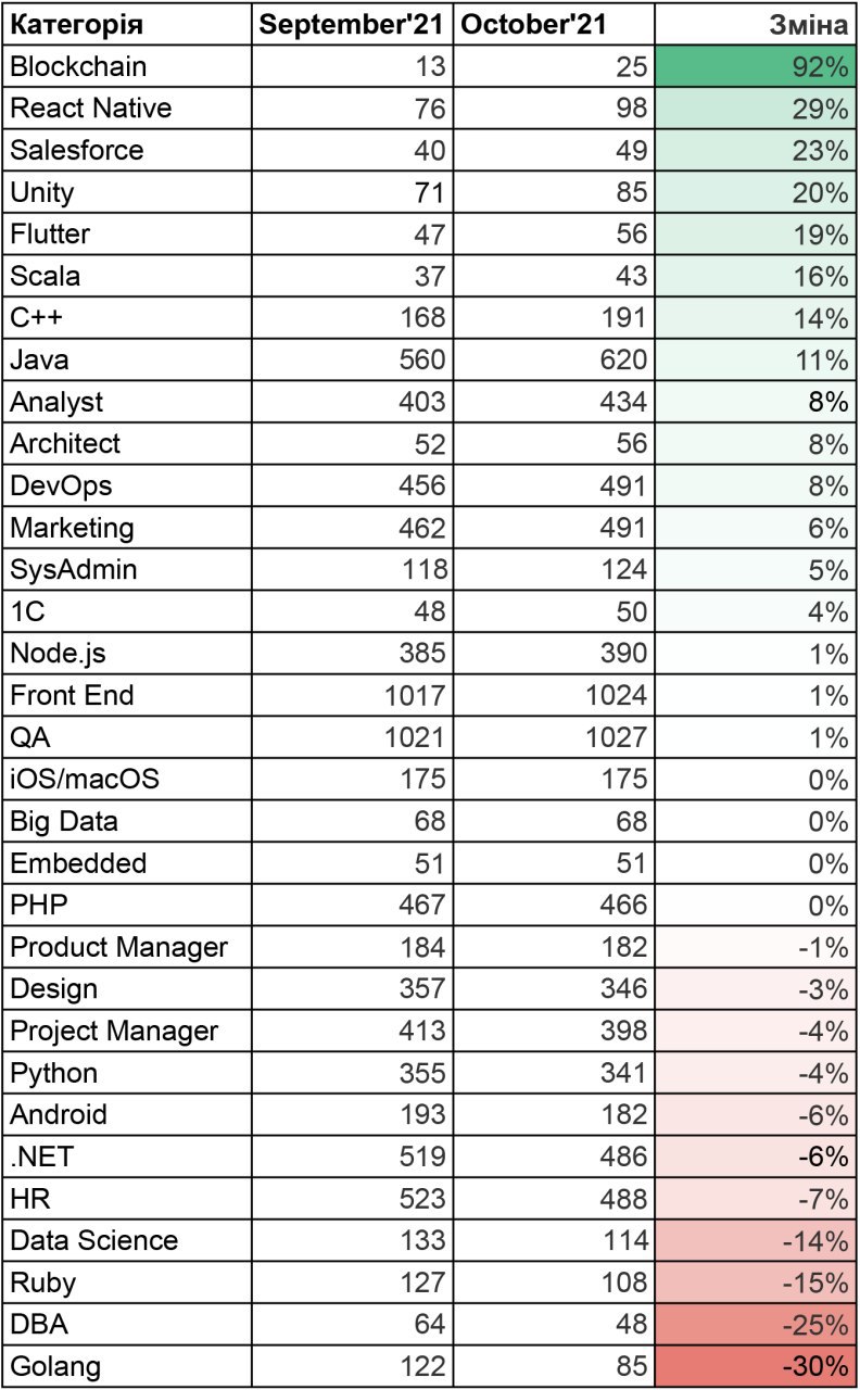 🟩 Найпозитивніша динаміка — у Blockchain, React Native, Salesforce, Unity та Flutter. Хоча в цих категоріях небагато вакансій.