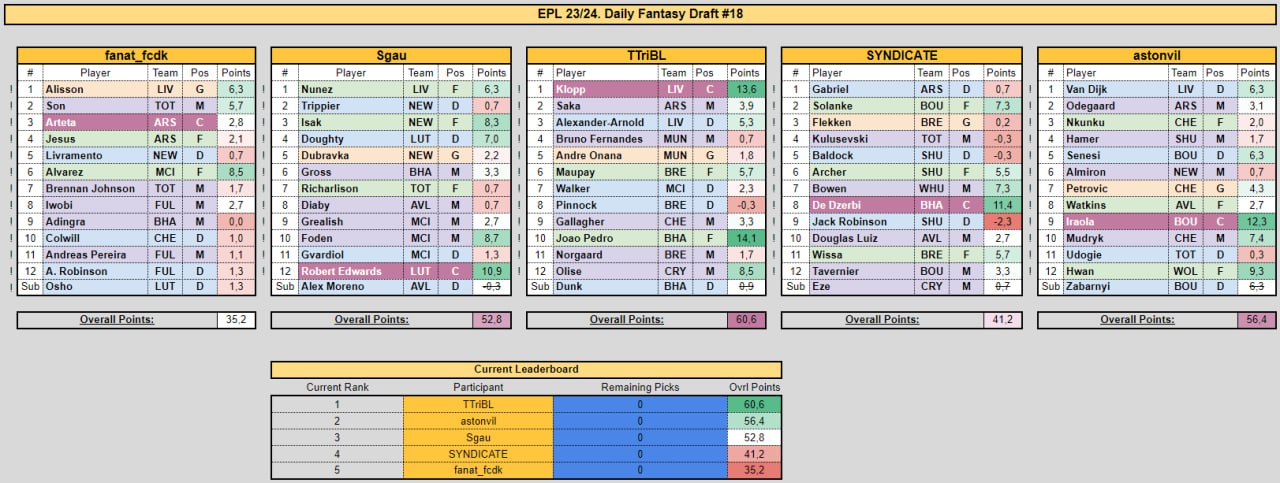 Smith1313 & astonvil набрали по 60.2 балла, и лишь благодаря десайдеру по таймингу окончания драфта Николай smith1313 становится вторым и забирает стоимость бай-ина себе назад.