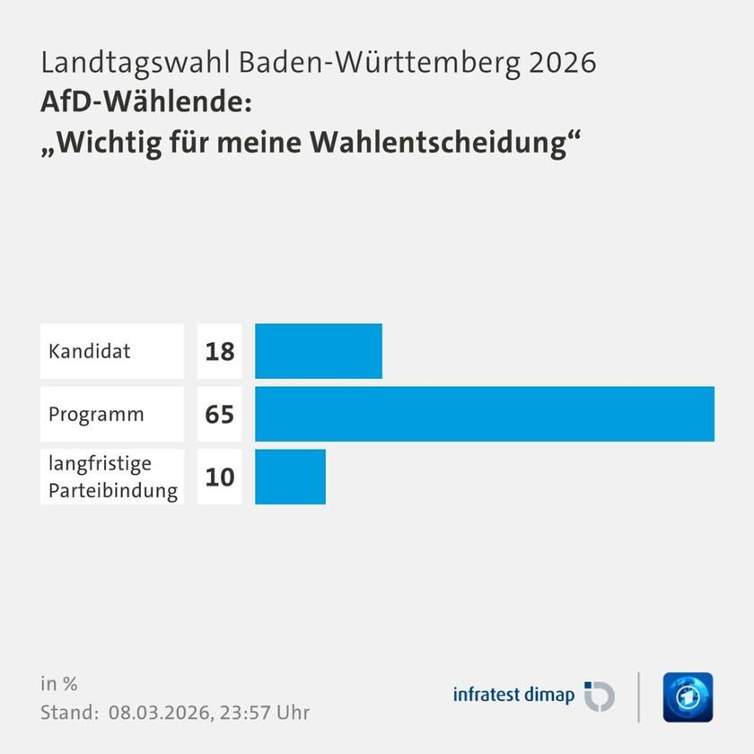 Bei der Landtagswahl in Baden-Württemberg gaben 65 % der AfD-Wähler an, dass das politische Programm prioritär wichtig für ihre Wahlentscheidung sei.