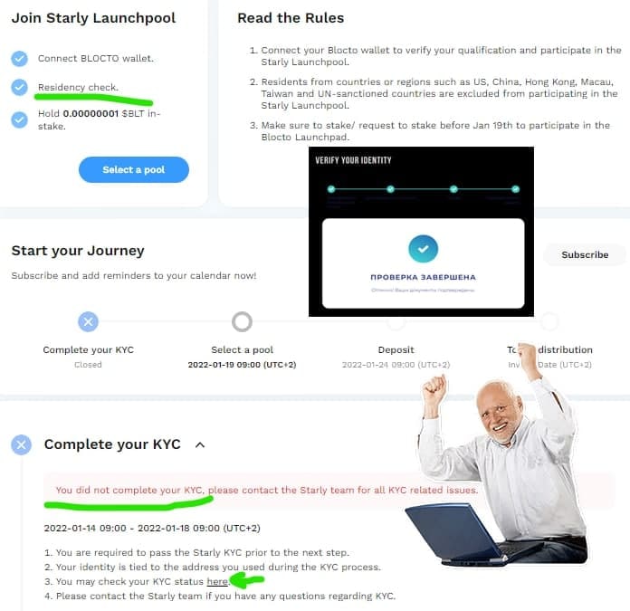 • Пока что у них косяк с якобы незавершенным KYC, о котором админы в самом чете блокто советуют жать на check status и ждать, хммм.