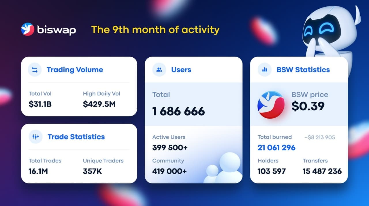 ▪️При этом Biswap постоянно держится в топ 3 по торговым объемам, кол-ву активных и новых пользователей, имеет инвестиции от Binance Labs, коллабы с огромным количеством проектов и кошельков: Coin98, SafePal, Faraland, Kalata, AlturaNFT, Hotcross и др.