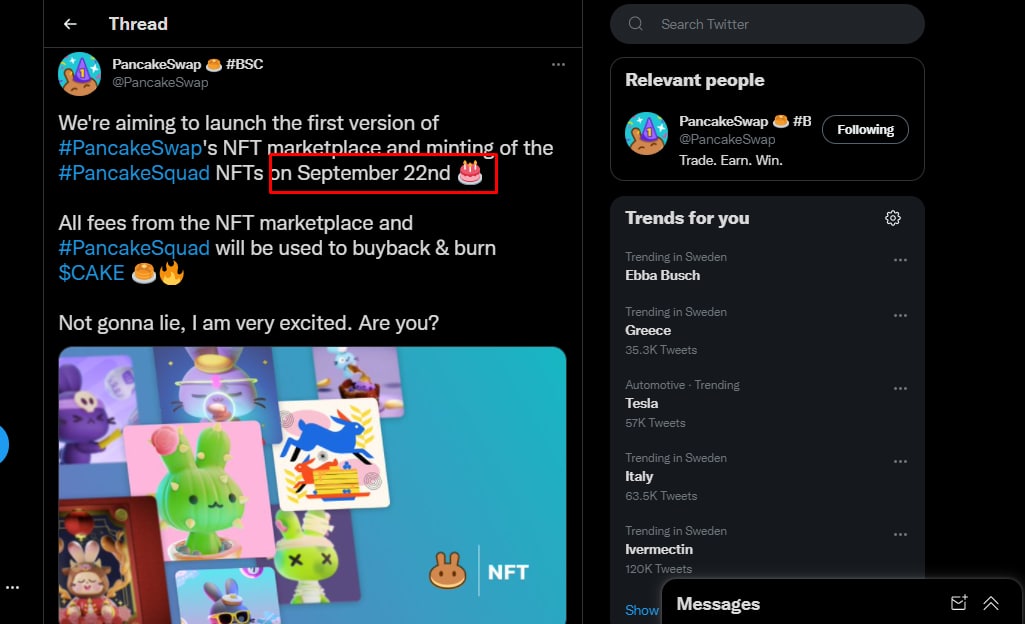 Сегодня в официальном твиттер-аккаунте Pancakeswap появился пост о точной дате старта NFT Marketplace - 22 сентября.