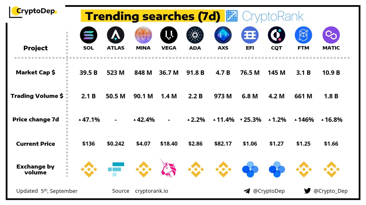 SOL - обновила ценовые максимумы, вышла в топ 7-8 по капитализации, при этом 47% роста за 7 дней