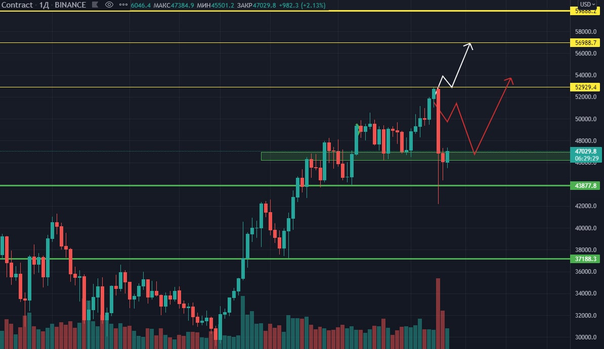 В посте от 06.09 мы на графике показали 2 вероятных сценария, один из них и подразумевал локальную коррекцию до $47000, откуп этой зоны и движение вверх. Поэтому сейчас придерживаемся этого же сценария.