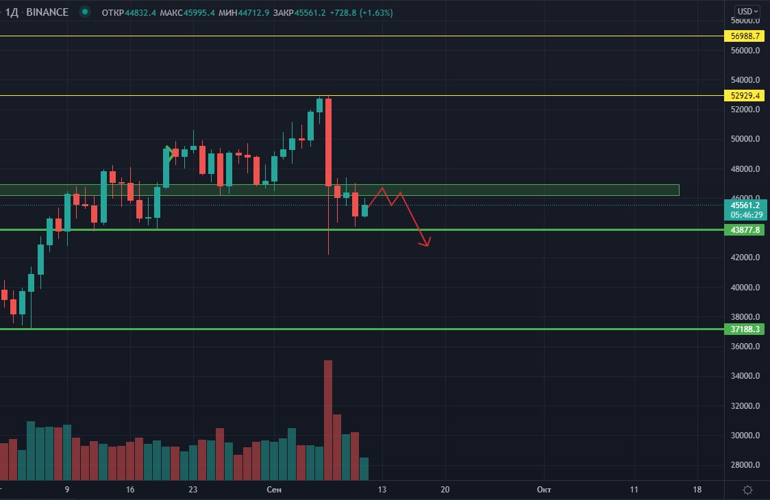 После сильной и внезапной коррекции на массовых ликвидациях шортов мы не увидели должного откупа, кроме того локальная зона поддержки на отметках $46-47000 не удержала натиск продавцов.