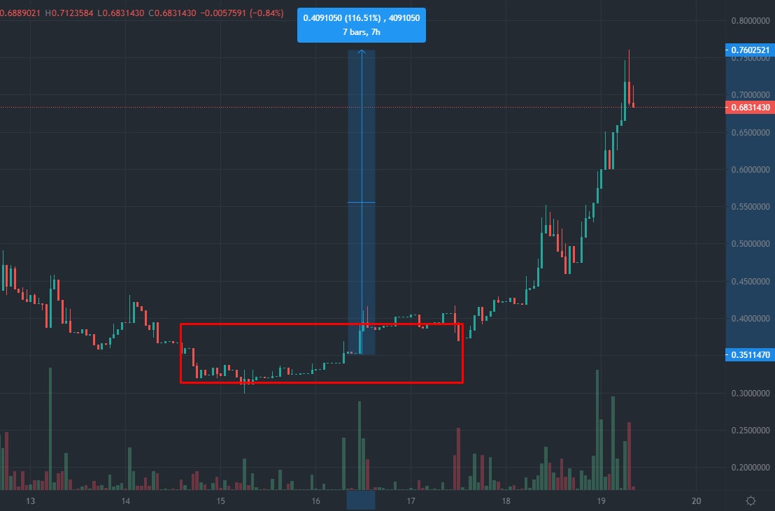 На анонсе листинга цена взлетела с $0.36 до $0.42 за токен. После откорректировалась до $0.35 и там же торгуется на данный момент.
