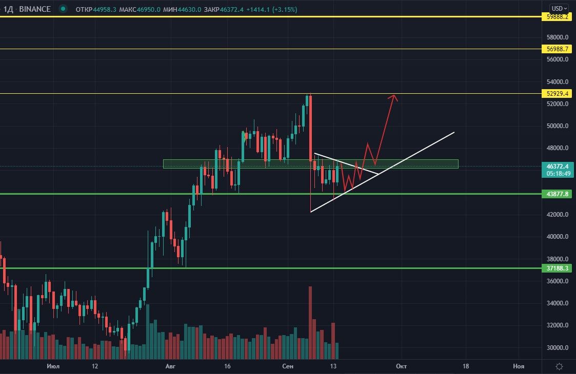 ✖️После сильной коррекции 7 сентября стоим в боковике. Все движения BTC ниже $44700 моментально откупается, на небольших, но объемах. Соответственно делаем вывод, что на этих отметках стоит крупный покупатель, который расставил свои ведра и накапливает позиции.