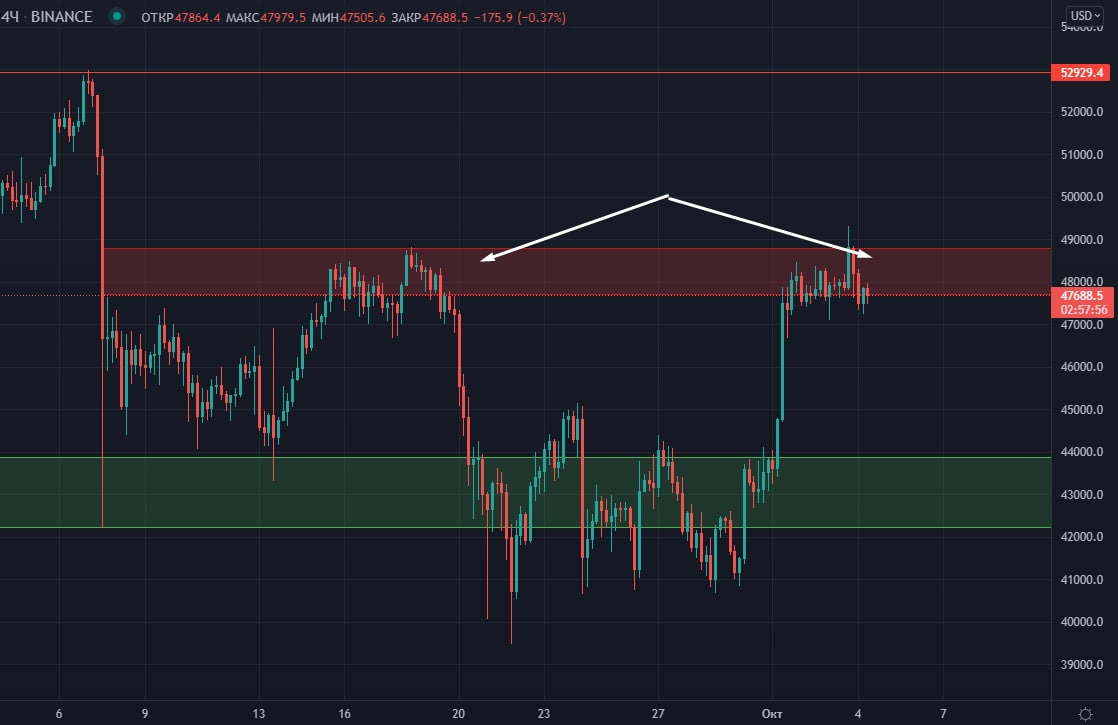 Далее видим резкий импульс, за 2 дня BTC вырос на +- $8000 и на данный момент удерживается на отметках в районе $48 000 - текущая зона сопротивления.