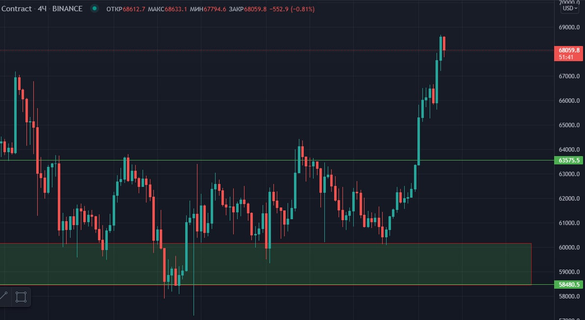 Сегодня утром BTC достигла цены в $68641, согласно CoinGecko. Рыночная капитализация BTC находится на уровне 1,28 трлн.