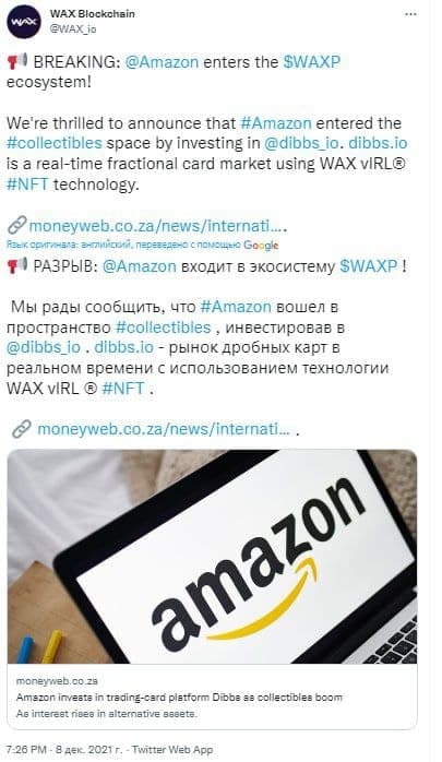 🔥Amazon инвестирует в NFT Marketplace Dibbs, по покупке/продаже спортивных NFT.