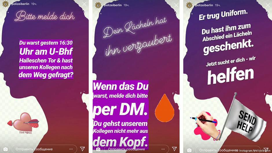 "Он был в форме. На прощание ты улыбнулась. Твоя улыбка околдовала его", - такое необычное сообщение появилось в Instagram полиции Берлина. С помощью социальных сетей полицейские решили помочь своему коллеге найти ту самую девушку. В обращении они просят ее откликнуться, потому что "она не выходит у него из головы".