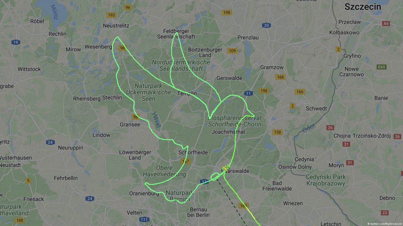 В результате на онлайн-карте сервиса FlightAware, отслеживающего воздушное движение в реальном времени, появился силуэт голубя - символа мира. После публикации в Twitter картинка разошлась по немецким соцсетям. Пилот-пенсионер уже не в первый раз "рисует" таким образом, используя онлайн-карты отслеживания полетов.