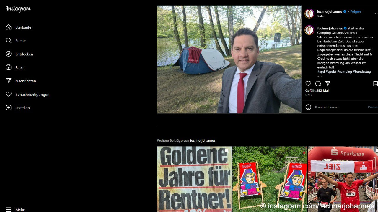 Фехнер не жалуется: говорит, соседи вокруг храпят, но это нормально. Из приключений он может вспомнить то, как однажды ночью лиса съела у его палатки утку, были жуткие крики, а также как на его палатку из-за сильного ветра упала ветка. В целом политик чувствует себя там расслабленно. В неделю Фехнер платит за кемпинг 72 евро, его месячная зарплата - 10 тысяч евро.