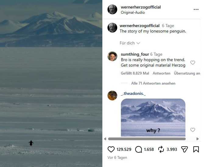 "Но почему?" - спрашивает режиссер Херцог в фильме 2007 года, и интернет в 2026 году сходит с ума. Сегодня пингвин стал символом кризисного времени, выражением тоски по тому, что все могло быть иначе - это одна из версий. Другая - птица уходит от всех и делает то, что считает нужным. Сам Херцог тем временем стал буквально культом. Его даже называют "любимым дедушкой поколения Z": он живет медленно, никуда не спешит и создает очень глубокие фильмы. А это очень нравится тем, кто устал от соцсетей. И мы их понимаем!