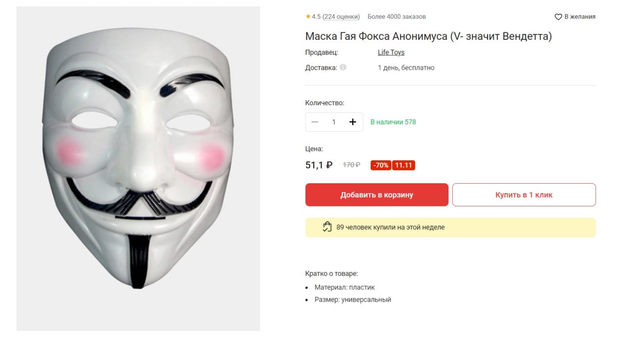 За последние две недели россияне купили тематические товары к празднику на 4 800 000 рублей. С 20 по 29 октября продажи карнавальных костюмов и аквагрима выросли на 430% (общая выручка — 660 000 рублей). Самым популярным товаром в категории стала маска Гая Фокса, ее продажи увеличились почти в 6 раз по сравнению с первыми неделями октября.