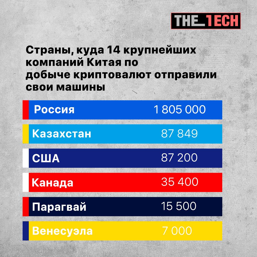 Весной в Китае ввели запрет на майнинг криптовалют. Согласно Financial Times, 14 крупнейших в мире компаний по добыче криптовалют перевезли из Китая более 2 млн. машин в течение нескольких месяцев после запрета. Львиная доля оборудования была перевезена в Россию (1,8 млн. машин).