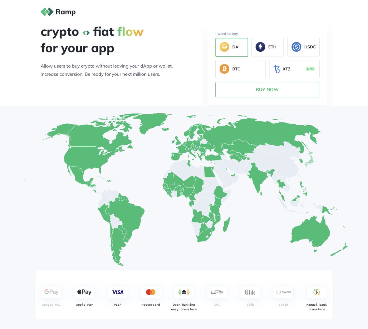 Платежная инфраструктура Ramp позволяет бизнесу встраивать оплату криптовалютой в свои цифровые сервисы. Главное преимущество перед Coinbase или eToro — бесшовность клиентского опыта: чтобы использовать криптовалюту для оплаты, пользователю не нужно переходить на на сторонний сайт. От продавца требуется буквально пара строчек кода.