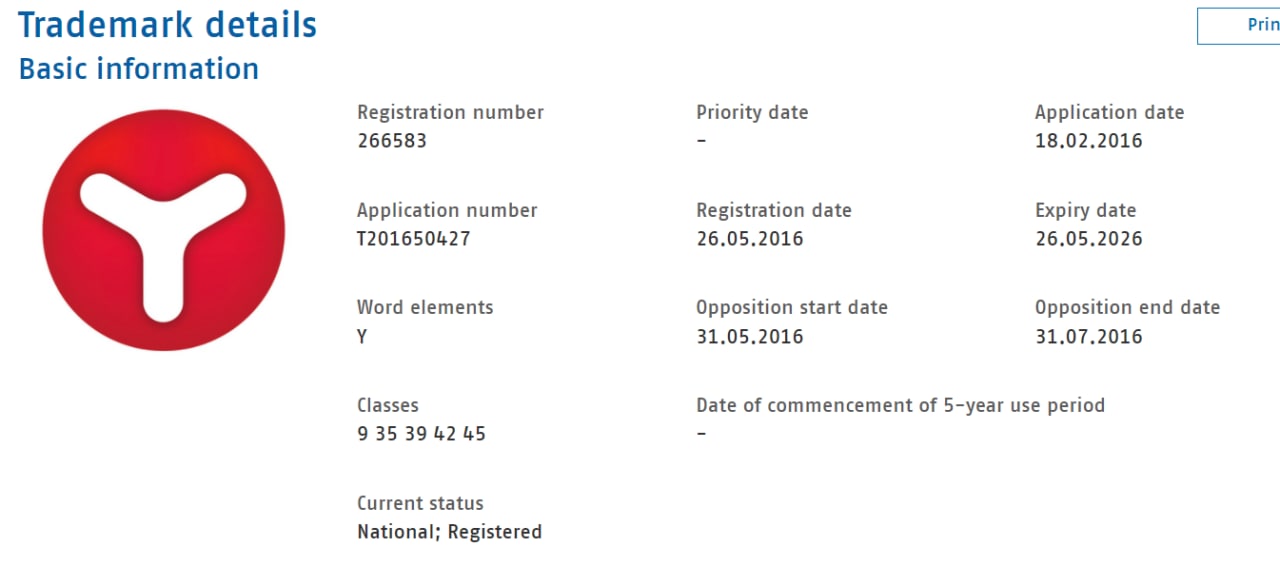 Ранее он подавал заявку о регистрации похожего товарного знака в виде буквы «Y» на красном фоне в Роспатент, однако в регистрации было отказано как раз из-за сходства до степени смешения с обозначением финской компании.