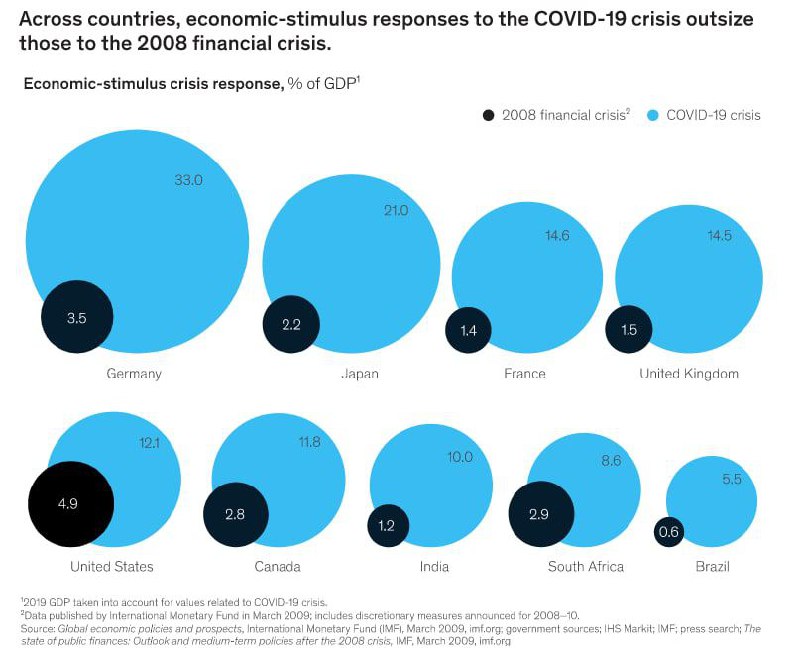 👩🎨 McKinsey ещё в июне подготовили очень симпатичную инфографику, которая сравнивает объём стимулирующих мер в 2019-2020 с антикризисными пакетами тех же стран в 2008-2009.