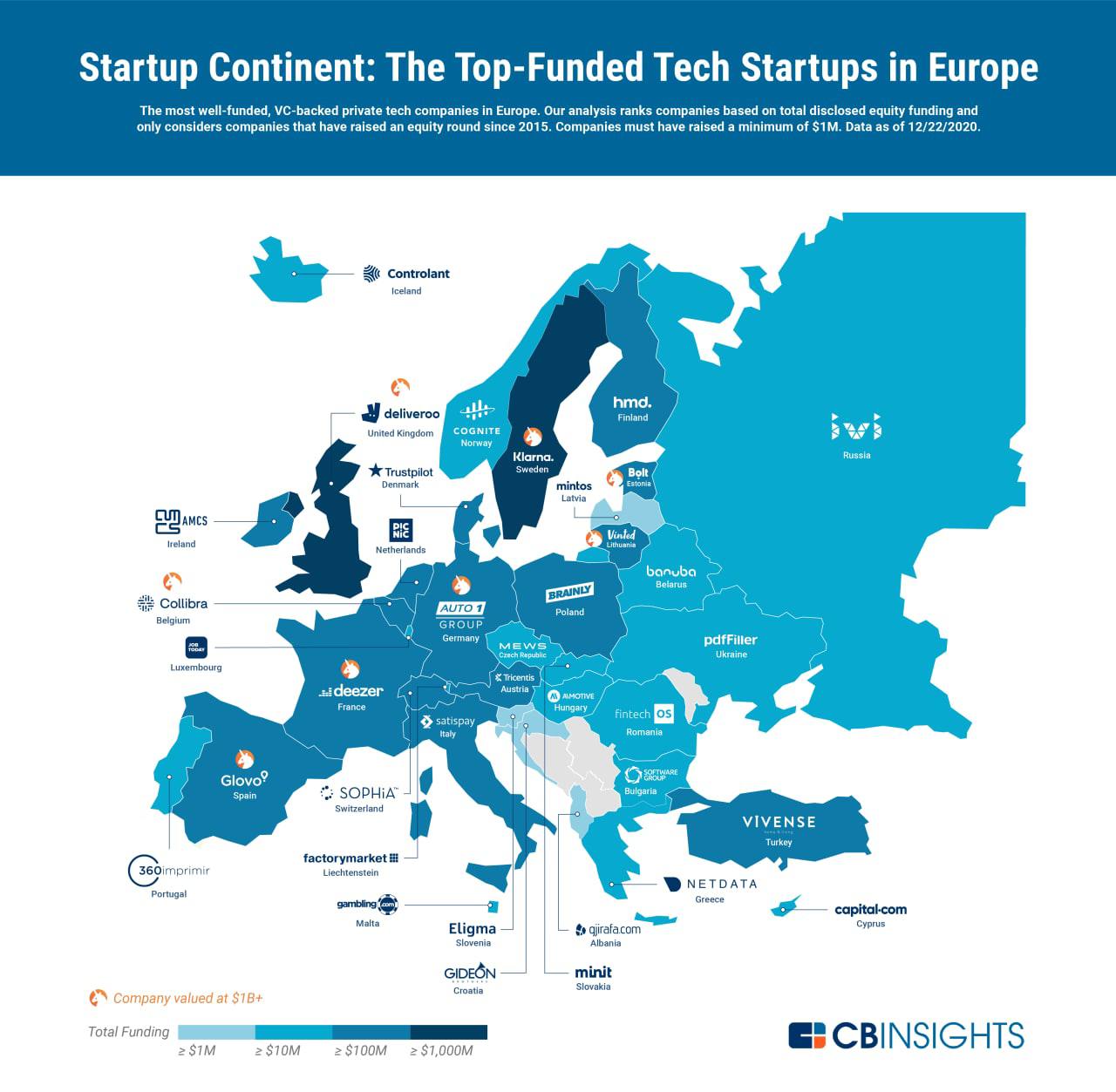 🗺 CB Insights выпустил отчёт о европейских стартапах, привлёкших наибольшее финансирование — суммарно лидеры привлекли более $9 млрд капитала (вот карта в большом разрешении).
