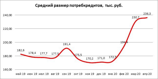 За последние 12 месяцев средняя сумма потребкредита не превышала 192 тыс. рублей, в марте она выросла до 231 тыс. рублей, в апреле — до 236,3 тыс. рублей.