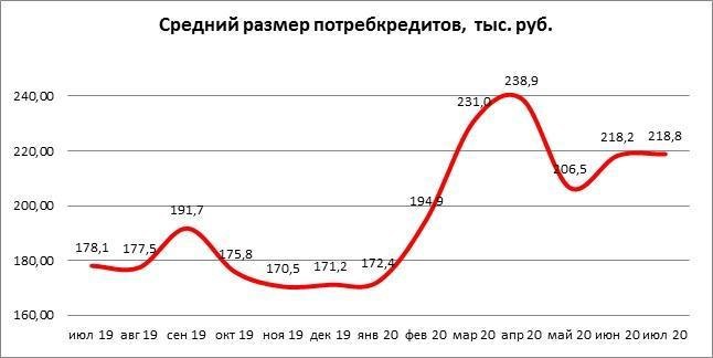 В июле средний размер потребкредитов вырос на 22,9% в сравнении с прошлым годом и составил 218,8 тыс. р.