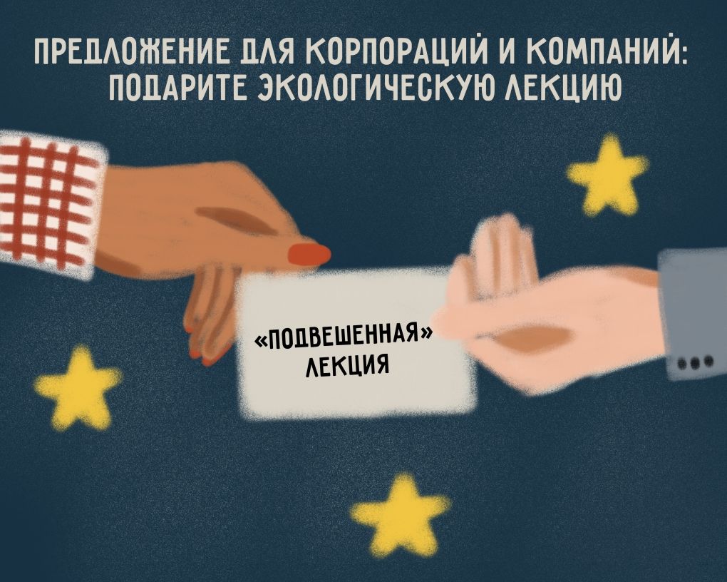 И мы решили провести новогоднюю экологическую акцию «Подвешенная» лекция» для организаций и компаний. Суть инициативы в том, что компания может купить одну или серию лекций для какого-то другого образовательного учреждения, социального проекта или инициативы, которые нуждаются в экологическом просвещении.
