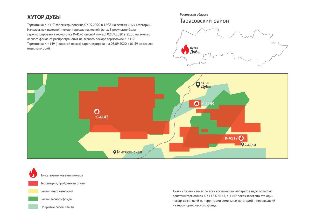 🌳 Изначально СМИ писали о лесных пожарах, однако по данным мониторинга, которые появились только сейчас, первая термоточка появилась на территории хутора Садки в 12:38 второго сентября. А затем уже огонь с хутора отнесло ветром в лесной массив. Огонь угрожал населенному пункту Дубы, откуда в спешном порядке были эвакуированы жители.