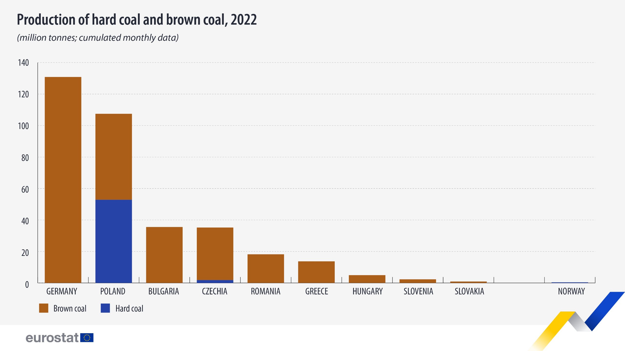 Нашел интересную статистику и инфографику у Евростата про уголь. Так вот, в 2022 году производство и потребление угля в странах Евросоюза продолжило расти. В целом добыча составила - 349 млн тонн (+5% по сравнению с предыдущим годом), потребление - 454 млн тонн (+2%) соответственно. Рост начался в 2021 году, в основном за счет бурого угля.