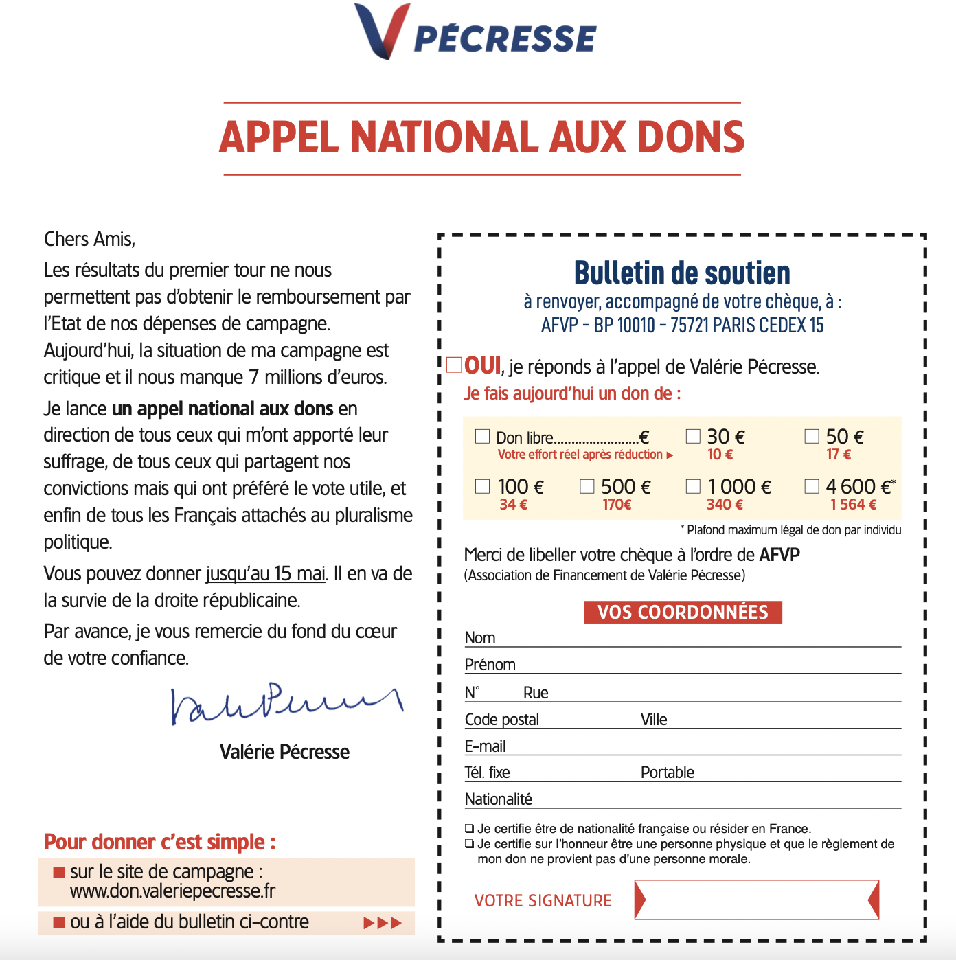 Если вы сильно превысите этот фонд, тогда вам поможет пример кандидата Валери Пекресс. Она не набрала 5% на выборах и теперь ей не хватает 7 млн. евро. Сейчас её штаб активно рассылает «письма счастья» по сторонникам и сочувствующим. В нём она просит о помощи в покрытии расходов на кампанию, ведь претендовать на возмещение от государства не может.