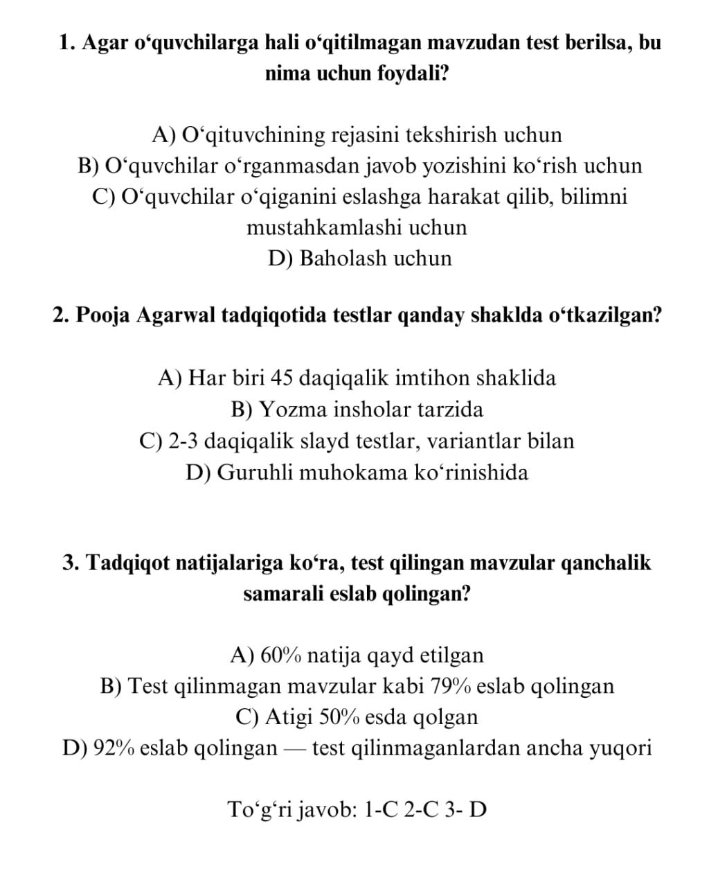 2. Дарс якунида. Шу куни ўтилган мавзу асосида тест олинади. Бу — эслаб қолиш ва мустаҳкамлашга ёрдам беради.