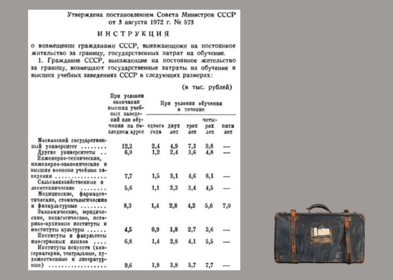 Но ручеек переселенцев не иссякал. Поэтому советские власти искали способ ограничить эмиграцию. Третьего августа 1972 года был принят указ Президиума Верховного Совета СССР «О возмещении гражданами СССР, выезжающими на постоянное жительство за границу, государственных затрат на обучение». На его основе Совет Министров СССР разработал секретную инструкцию о размерах возмещения этих затрат.