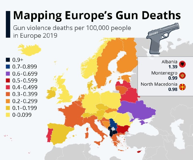 Интересная статистика подъехала. Согласно последним доступным данным Института показателей и оценки здоровья, в Албании в 2019 году наблюдались самые высокие показатели насилия с применением огнестрельного оружия в Европе: 1,39 случая смерти от насилия с применением огнестрельного оружия на 100 000 человек.