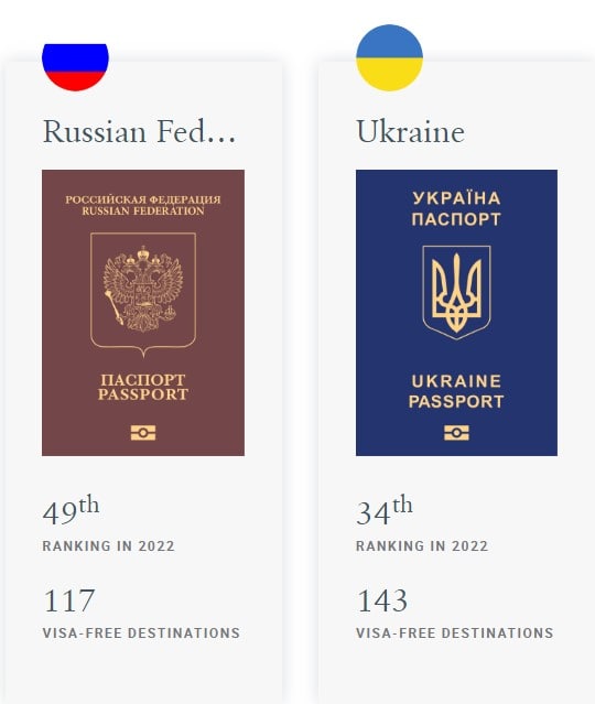 Давайте сравним силу паспортов этих стран сегодня: 117 безвизовых стран у России и 143 у Украины.