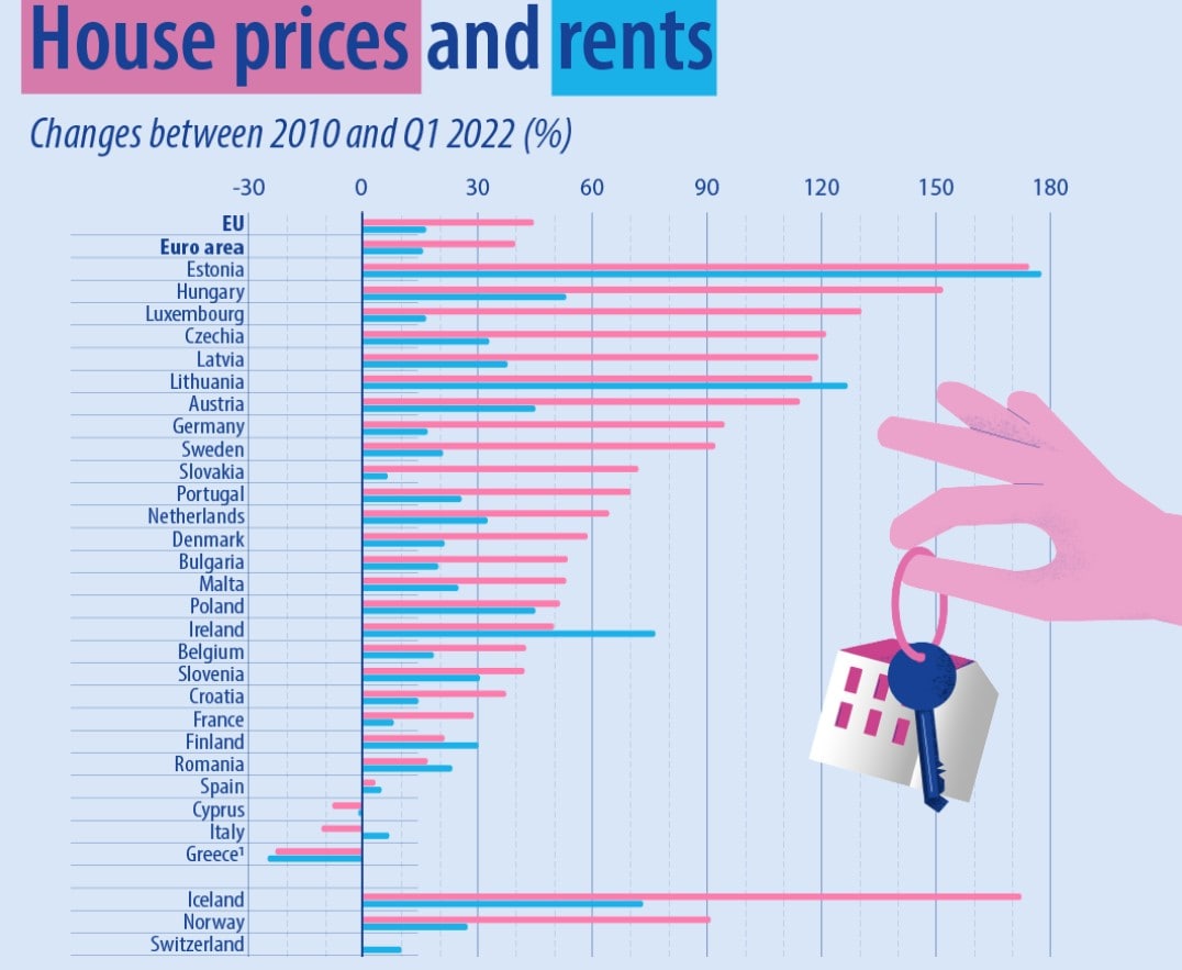А во-вторых, Евростат выкатил новые цифры: цены на жилье с 2010 года выросли в 24 странах-членах ЕС и снизились в трех, при этом самый высокий рост в Эстонии (+174%), Венгрии (+152%) и Люксембурге (+131%).