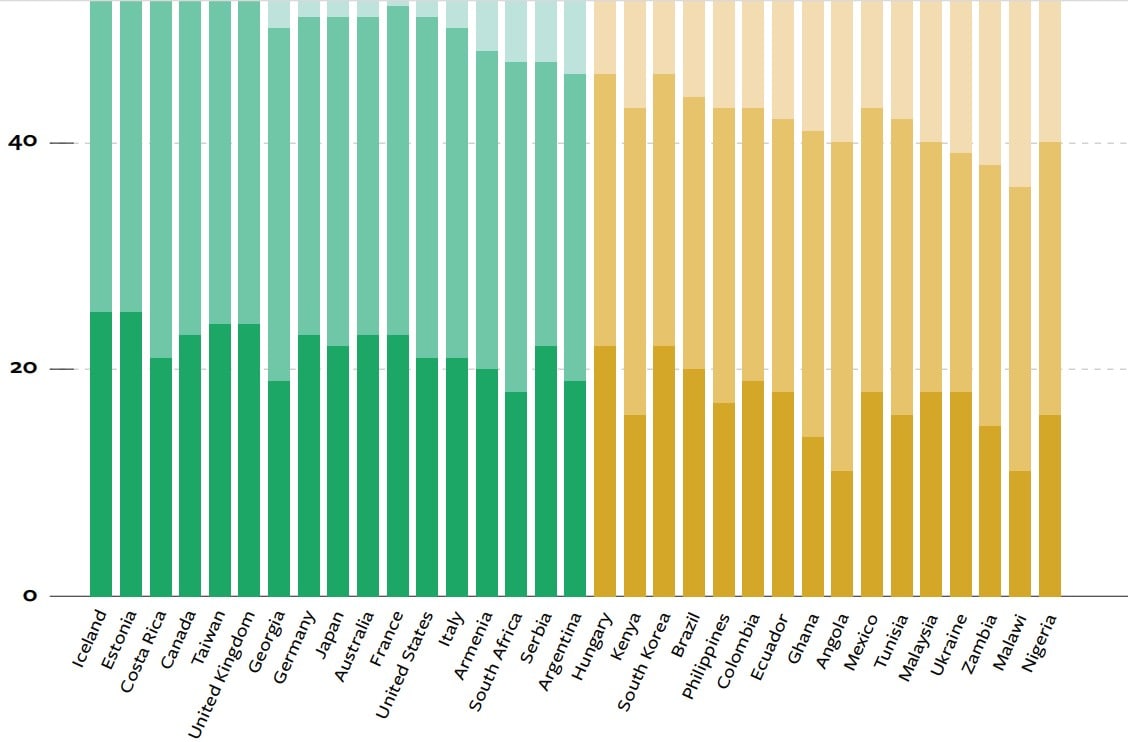 Хуже ситуация со свободой в интернете только во Вьетнаме, на Кубе, в Иране, Мьянме и Китае. Самый свободный Интернет в Исландии, Эстонии, Коста-Рике и Канаде. Также в ТОП-10 вошли Тайвань, Великобритания, Грузия, Германия, Япония, Австралия.