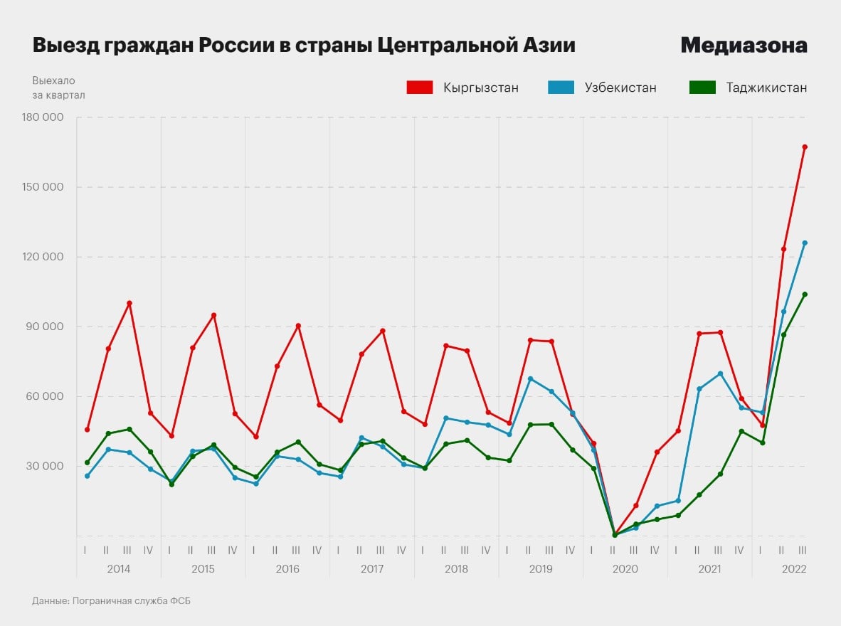 По данным погранслужбы ФСБ, в июле-сентябре граждане России совершили 9,7 млн поездок за границу. Это почти в два раза больше, чем в период с апреля по июнь (4,9 млн). В третьем квартале 2022 года россияне поставили рекорд по поездкам в страны Центральной Азии — Казахстан, Кыргызстан и Таджикистан; также в Армению и Монголию.