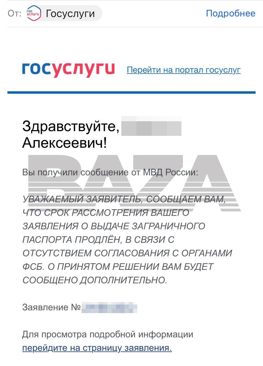 "Уважаемый заявитель, сообщаем вам, что срок рассмотрения вашего заявления о выдаче заграничного паспорта продлён в связи с отсутствием согласования с органами ФСБ. О принятом решении вам будет сообщено дополнительно".
