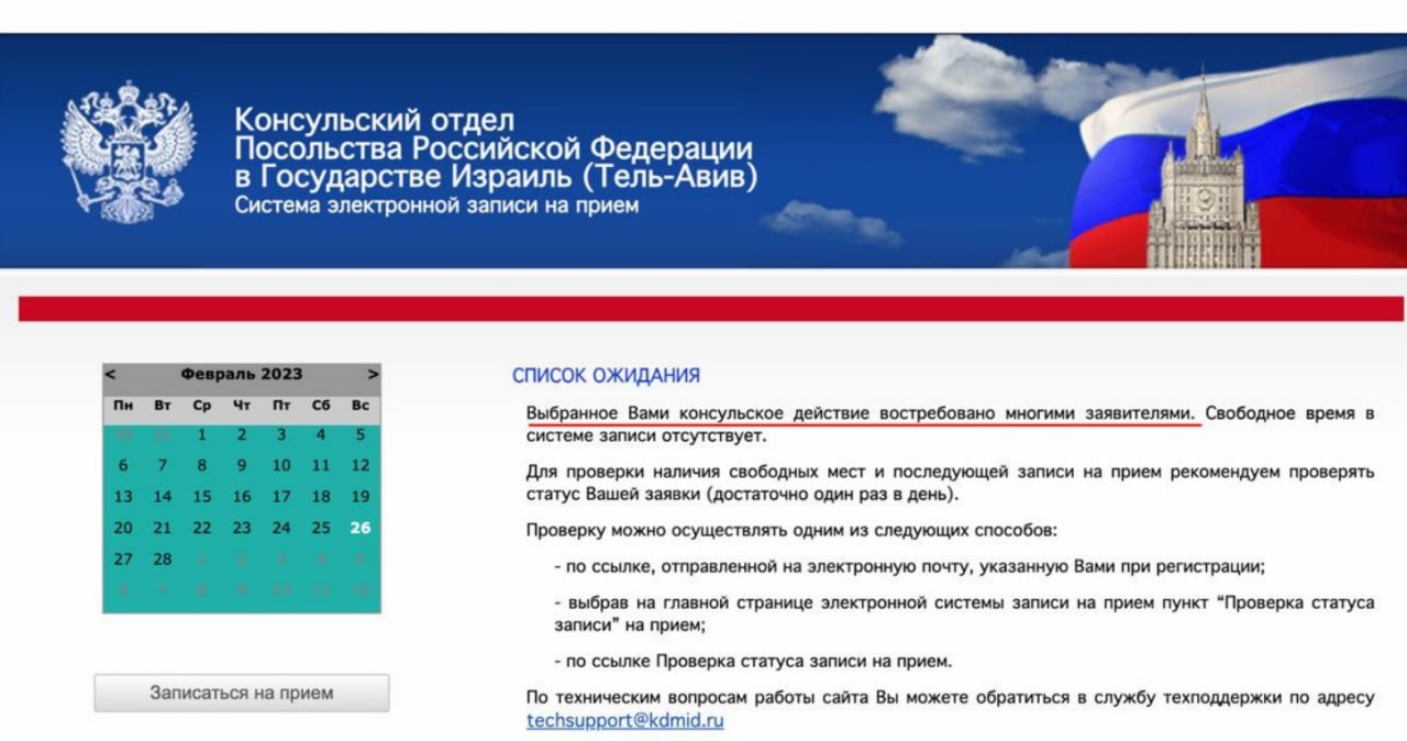Эмигрицепсу стало известно о том, что записаться на подачу документов для отказа от гражданства РФ в посольство РФ в Израиле невозможно.