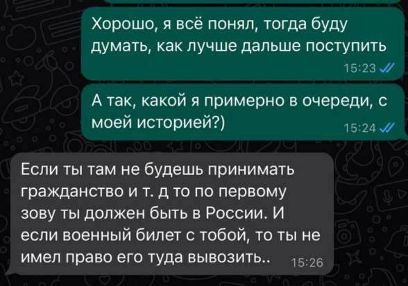 Мама и сотрудники военкомата не очень поняли друг друга. Далее уже в онлайн-переписке сотрудник военкомата заявил Игорю, что если он не будет получать другого гражданства, то "должен быть в России по первому зову" и вообще, лучше бы все-таки приехать, зайти в военкомат, сдать военный билет и получить некую "справку на выезд". А иначе штраф.