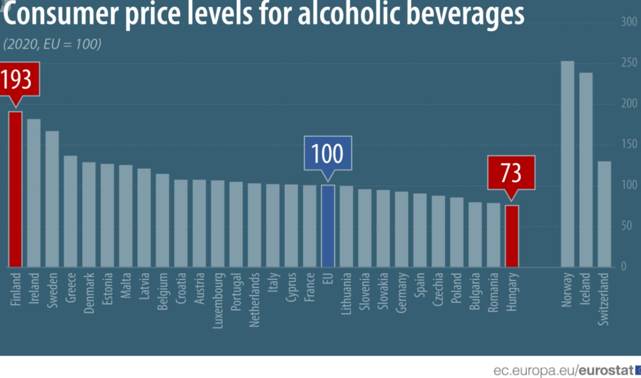 😩 Евростат обозначает средний уровень цен в ЕС цифрой 100. ТОП стран, где эмигранта с пагубной привычкой ждет разорение и жизнь под мостом, выглядит так: Финляндия (193), Ирландия (181), Швеция (166). Удивительно, что далее следует Греция. В Эстонии и Латвии жизнь алкоголика тоже терниста.