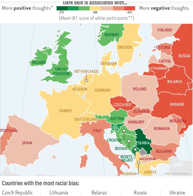 Судя по некоторым баталиям в чате, среди подписчиков есть националисты и расисты. И они тоже хотят свалить из России. 😂 Вот данные исследования ученых Гарвардского университета, показывающие, в каких странах Европы темный цвет кожи вызывает негативные эмоции, а в каких - позитивные.