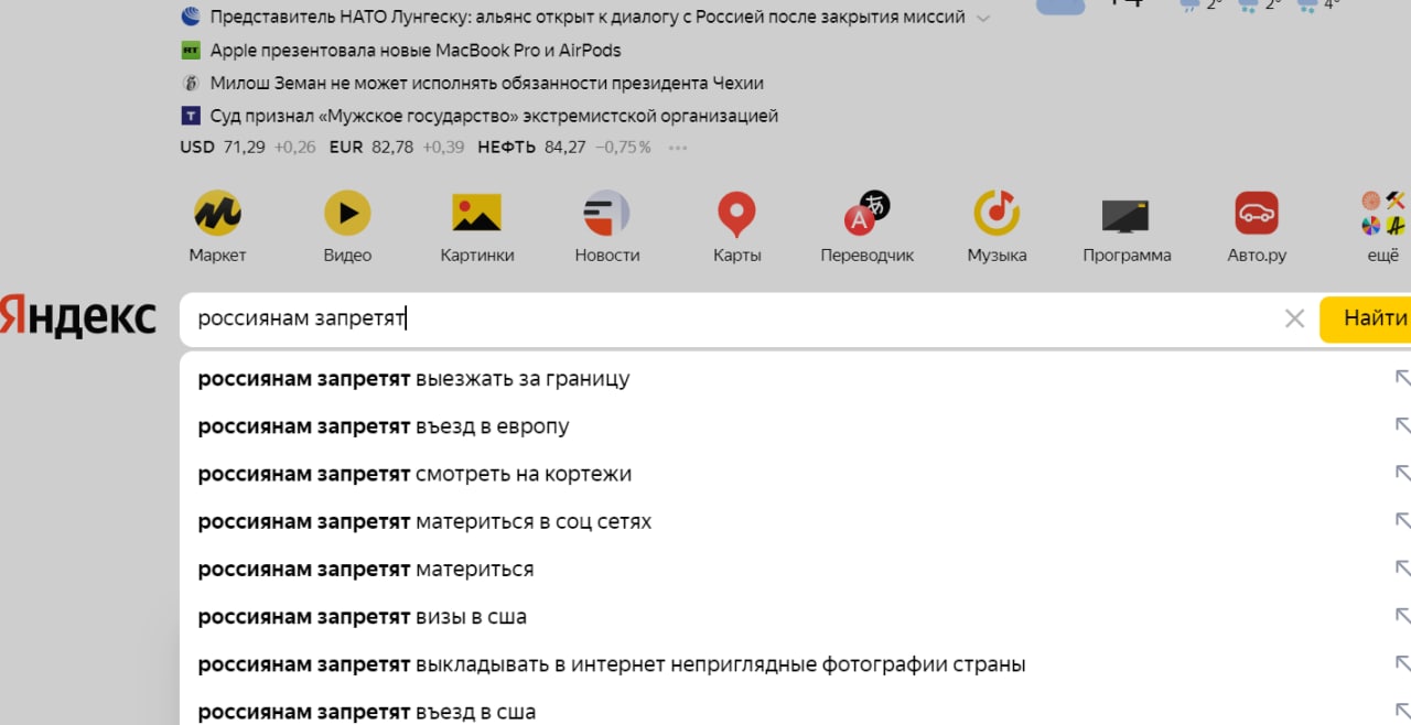 Поисковые подсказки Яндекса показывают варианты наиболее популярных запросов, которые начинаются на те же буквы, что и ваш запрос. И заодно раскрывают главные страхи россиян. Главный из которых вполне понятен - страх “железного занавеса”... 🤔