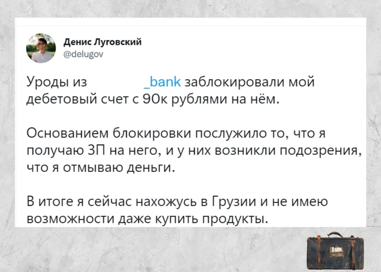Предположим, вы уехали жить за границу с российской банковской картой. Поселились, работаете удаленно, на фрилансе. Наличных мало или совсем нет, потому-что картой платить удобнее. Зарплата “капает” на карту. И вдруг в один момент происходит то, что произошло с Денисом Луговским - эмигрантом из России, который сейчас живет в Грузии.