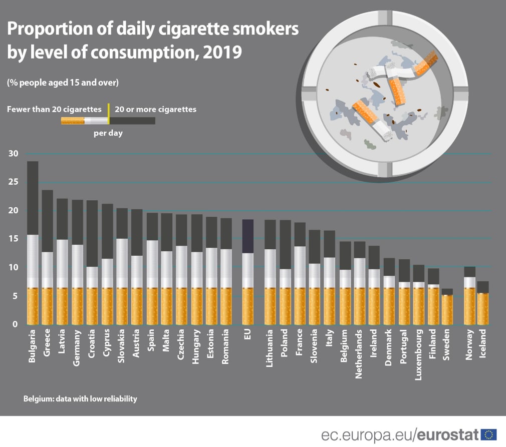 Так вот, согласно данным Евростата, в 2019 году среди стран-членов ЕС наибольшая доля ежедневных курильщиков сигарет наблюдалась в Болгарии (28,7%), Греции (23,6%), Латвии (22,1%), Германии (21,9%) и Хорватии (21,8%).